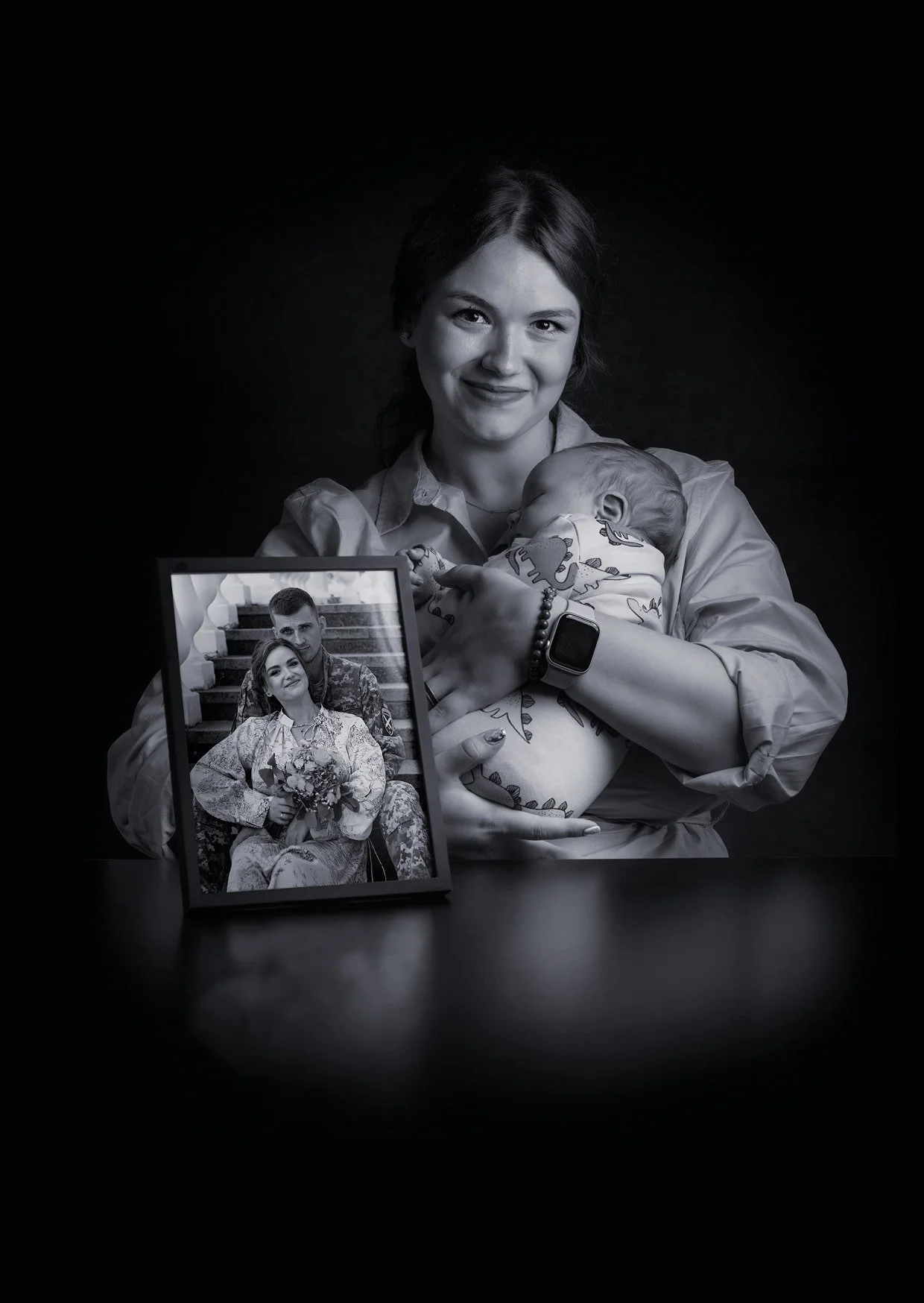 Anastasiia Sierik-Kulaha floh mit ihrer Mutter (42) und ihrem Bruder (6) aus Kiew und wohnte zunächst in einer Gemeinschaftsunterkunft der Gemeinde Königsfeld. Im Sommer 2022 reiste sie in die Ukraine, um ihren Mann zu heiraten. Im Mai 2023 brachte sie in Rottweil ihren Sohn David zur Welt. Seitdem wünscht sie sich nichts sehnlicher, als dass ihr Mann seinen Jungen in den Armen halten kann. Vor dem Krieg hatte Anastasiia bereits eine eigene Praxis für Rehabilitation und Physiotherapie. Im Moment sieht sie ihre Hauptaufgabe darin, eine gute Mutter zu sein und Deutsch zu lernen. Den Tod von Freunden und Bekannten in der Ukraine betrachtet sie einerseits mit Abstand, andererseits voller Angst. Die Liebe zu ihrem Land und ihrer Familie gibt ihr Kraft, nicht zu verzweifeln.